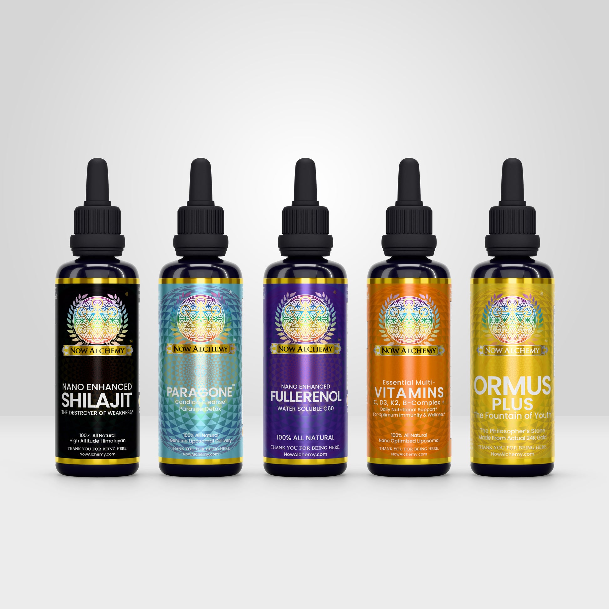 1 bottle of Ormus Plus, 1 bottle of Fullerenol, 1 bottle of Shilajit, 1 bottle of Vitality, and 1 bottle of Detox.